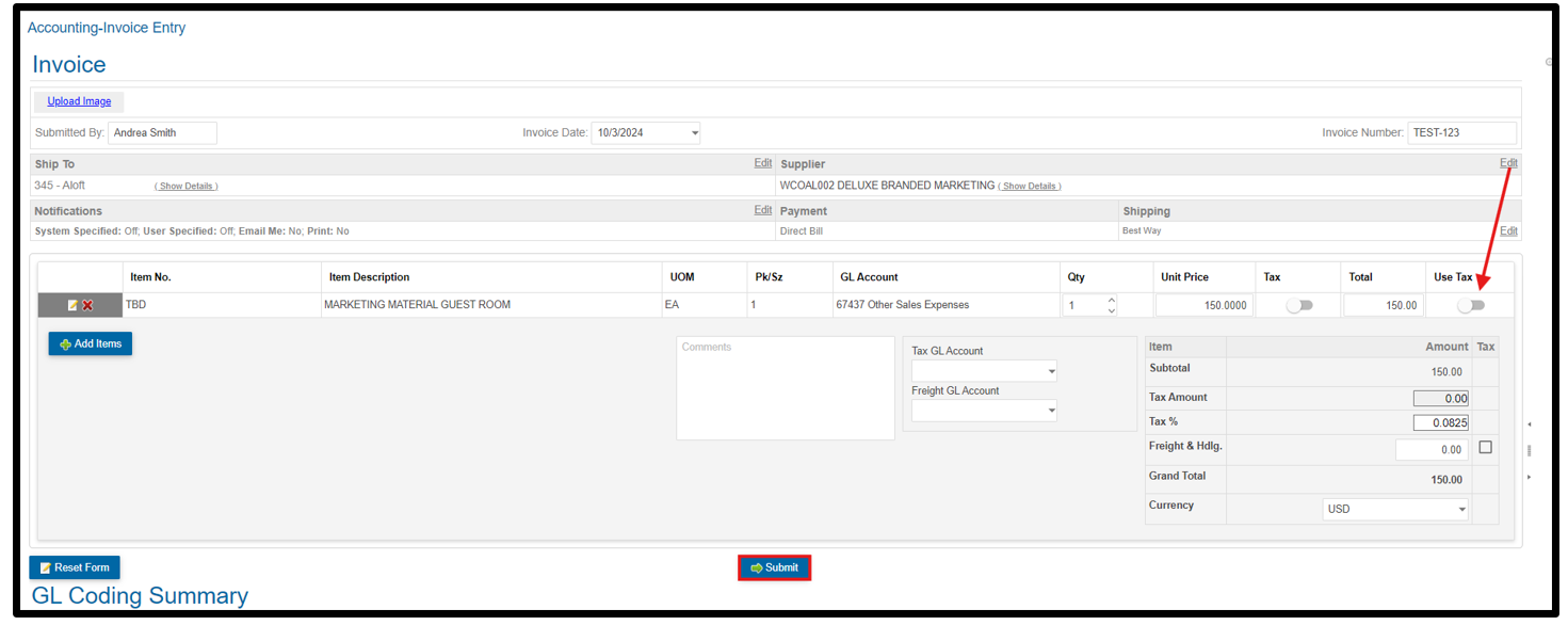 Toggle on the Use Tax indicator for the line item(s) needing use-tax accrued