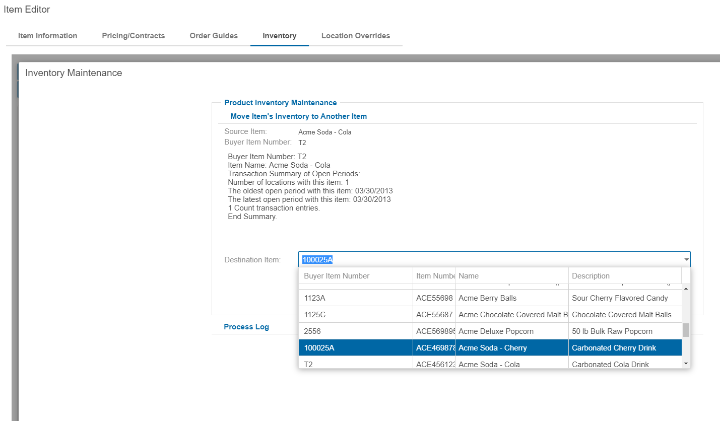 On the Inventory Maintenance popup, select a Destination Item that all transactions should be linked to and click the Move Item's Inventory button.