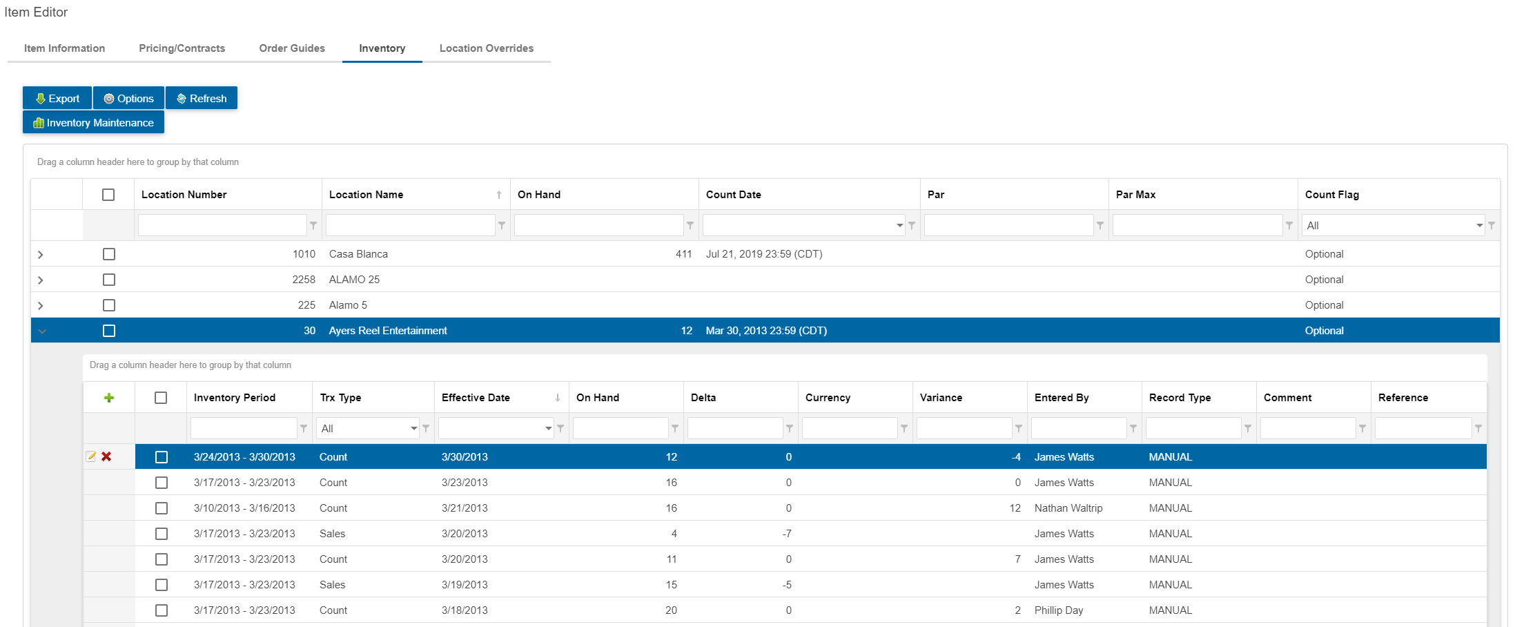 If this item requires changes to inventory transactions, click on the Inventory tab at the top of the editor to reveal a list of locations that have inventory transactions related to the selected item.