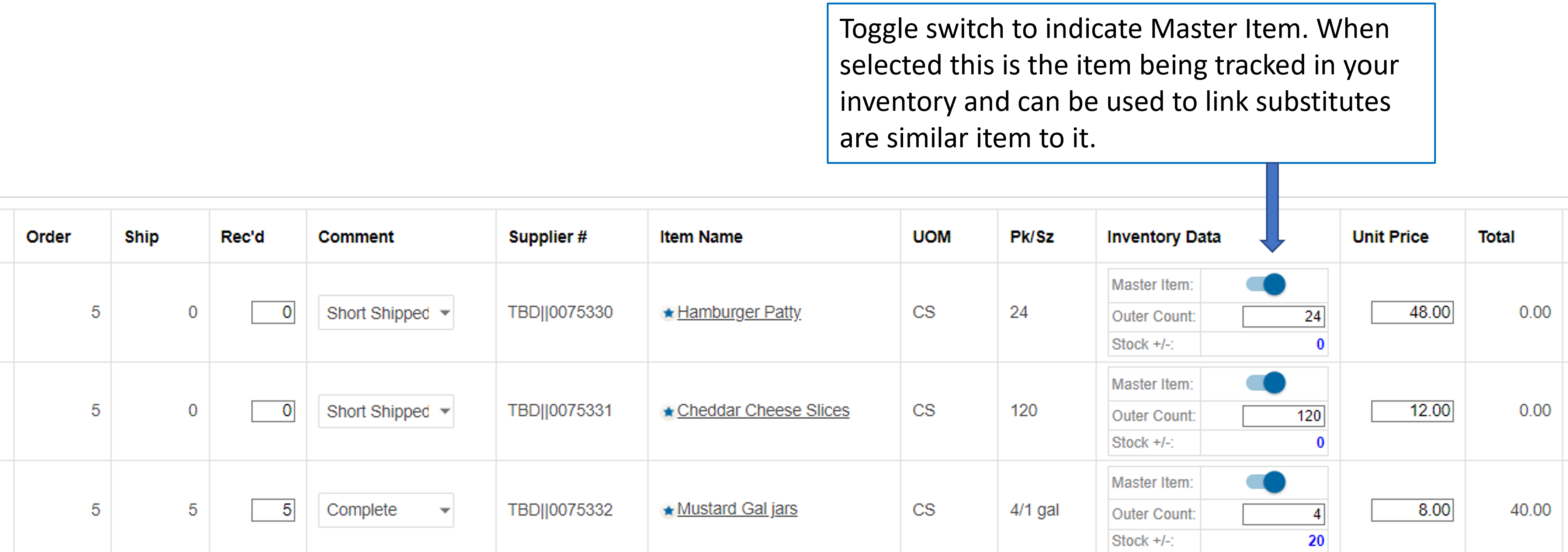 For new items, or items that you want to start tracking separately, you can toggle the Master Inventory item flag to the “On” position. Don’t forget to set the correct Outer Count to reflect your Inventory UOM.