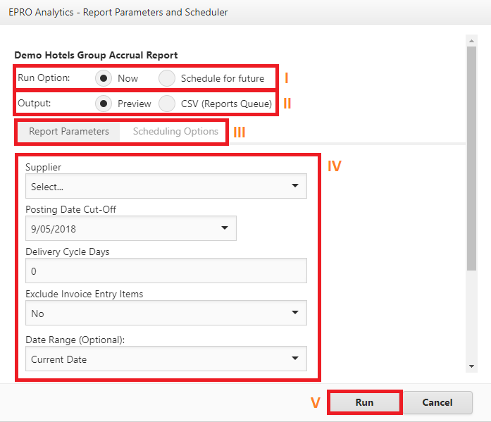 I - The Run Option Switches enable a report to be ran now, or in the future. If “Schedule for future” is chosen, many more output options will appear. Parameters may need to be set for configuring a Scheduled report. View “III” for more information.